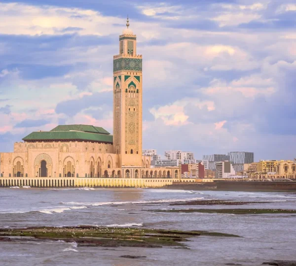 Depart from Casablanca and travel to Marrakech. Visit the Hassan II Mosque exterior before continuing the trip. Upon arrival, explore Jemaa el-Fna square, the souks, and the Medina. Overnight in a mid-range riad in Marrakech.